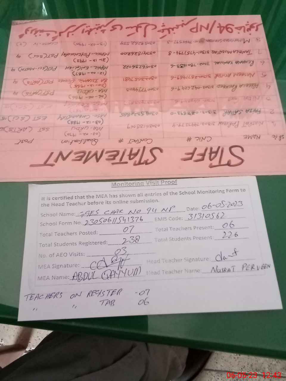 | EMIS Code: 31310562 | Name of School: GGES CHAK NO. 94/NP | |||
