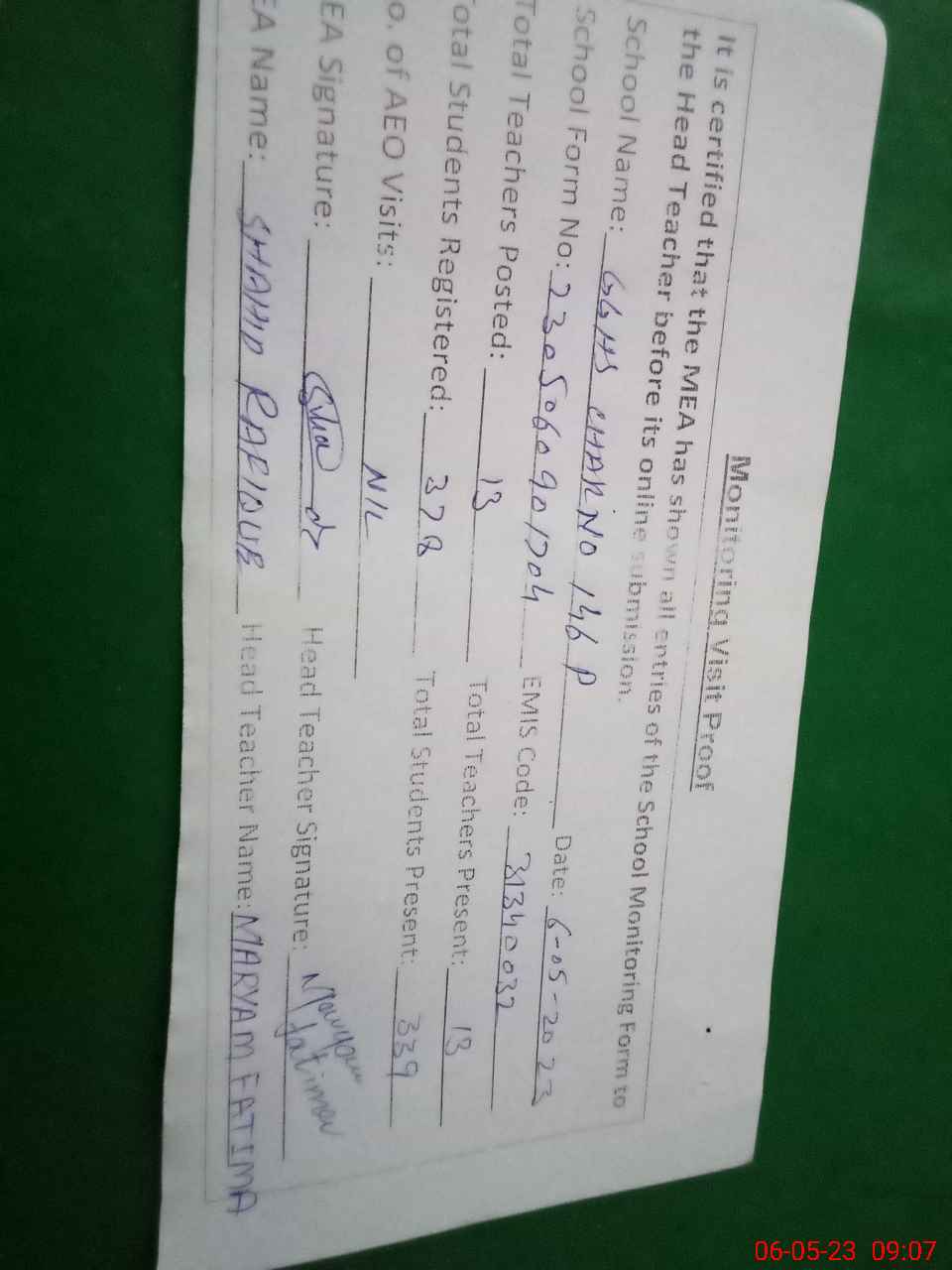 | Attendance Register | Head Teacher | MEA with School | Visit Proof |