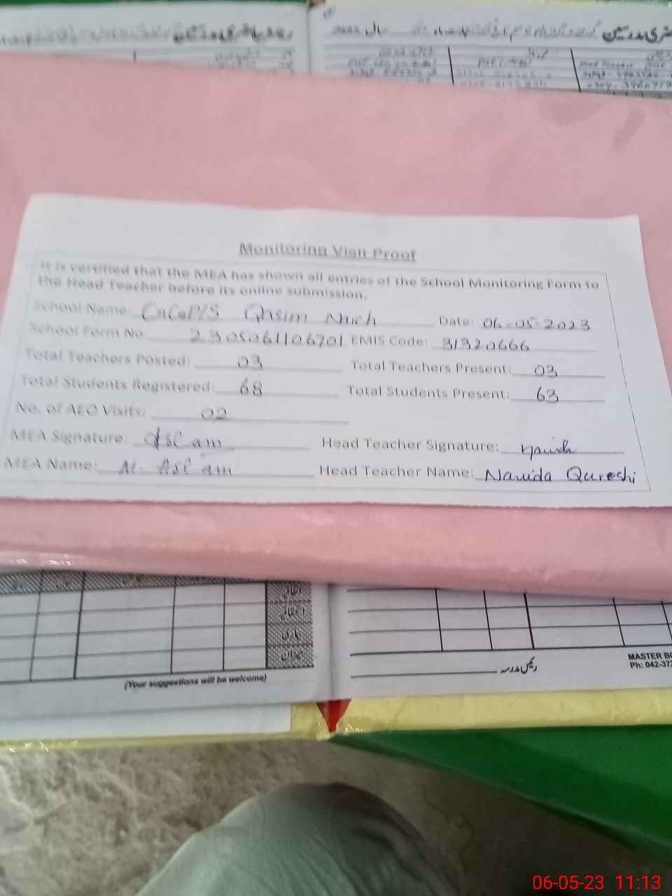 | Attendance Register | Head Teacher | MEA with School | Visit Proof |