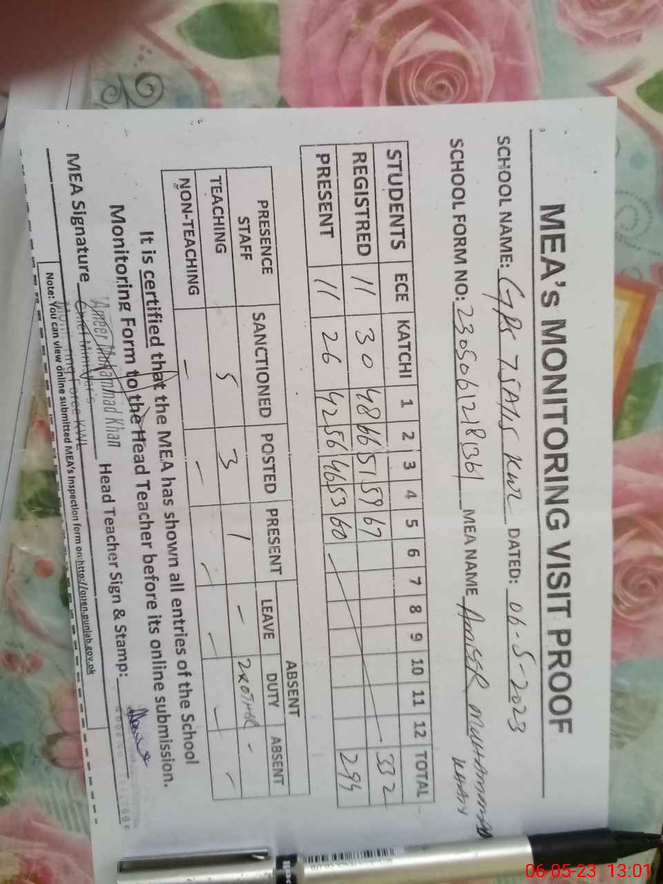 | Attendance Register | Head Teacher | MEA with School | Visit Proof |
