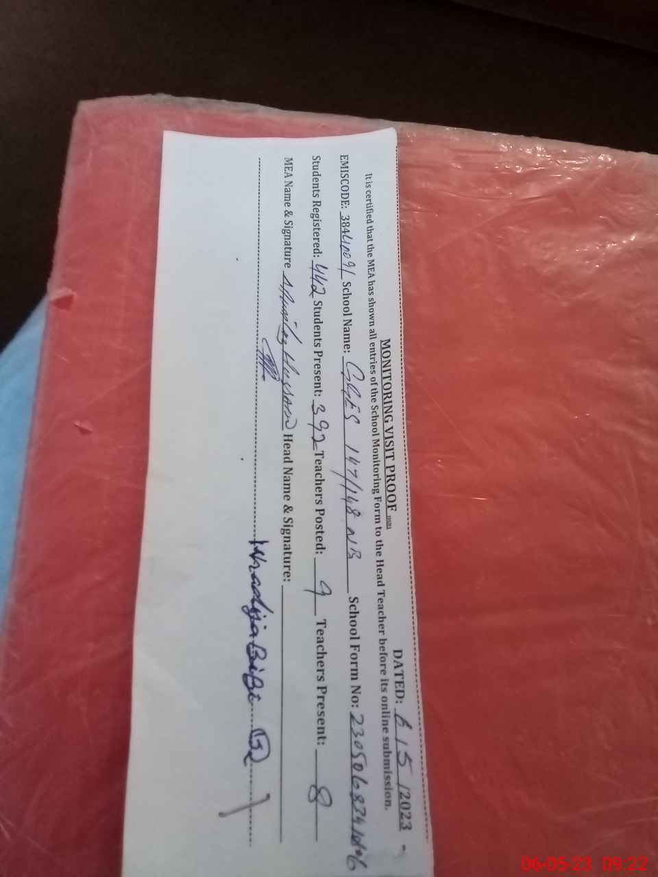 | Attendance Register | Head Teacher | MEA with School | Visit Proof |