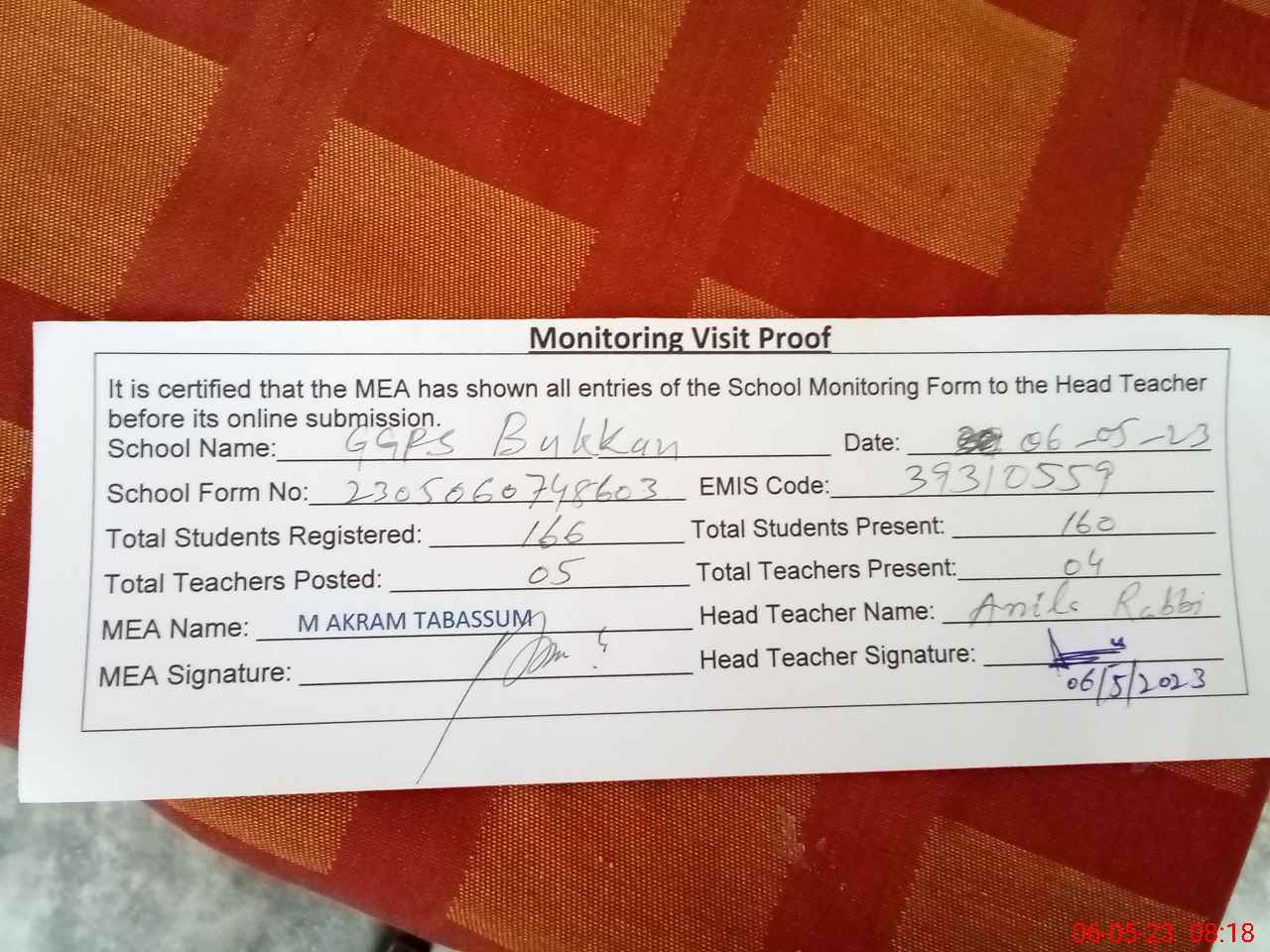 | Attendance Register | Head Teacher | MEA with School | Visit Proof |