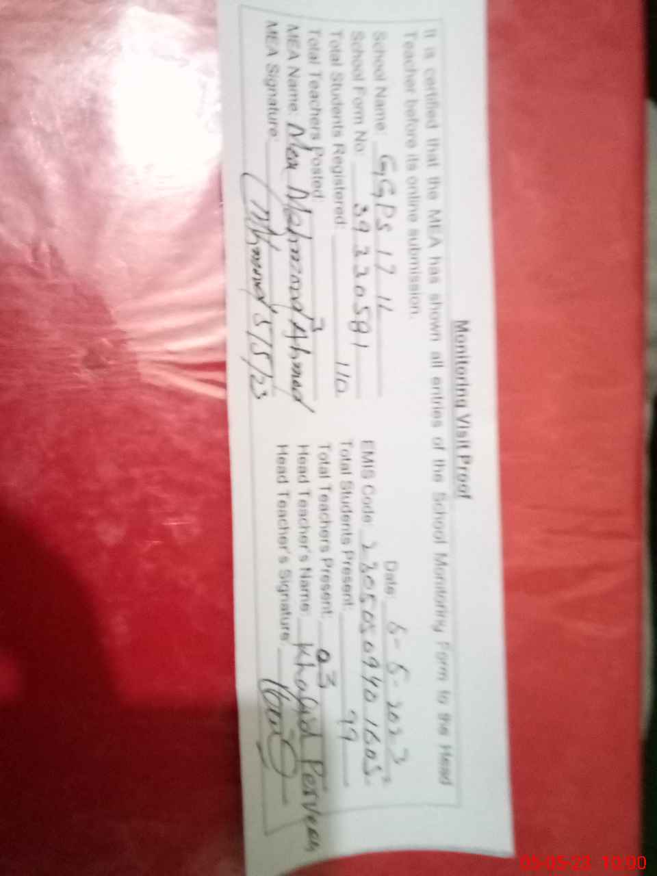 | Attendance Register | Head Teacher | MEA with School | Visit Proof |
