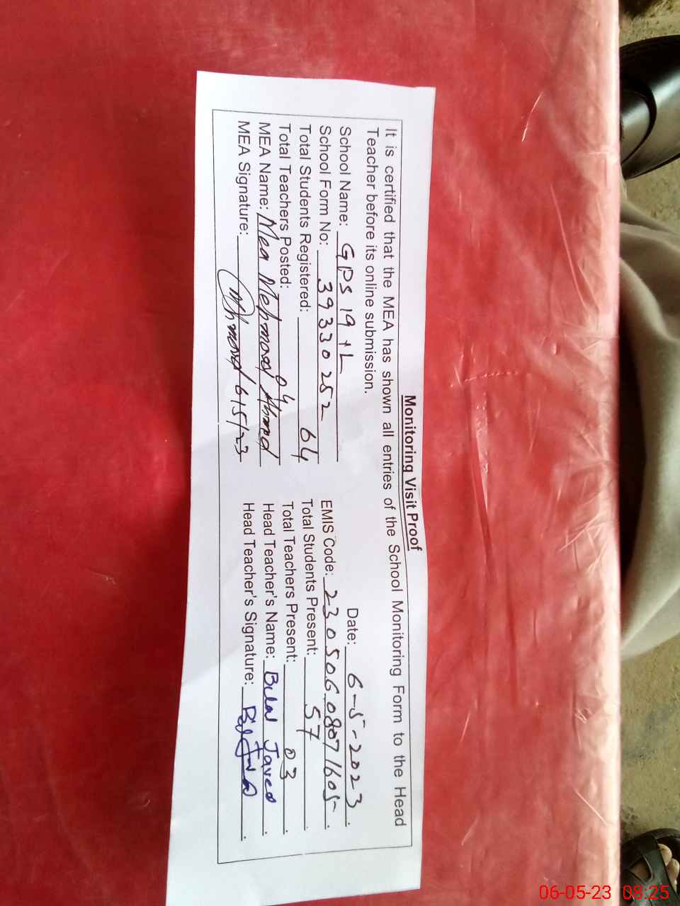 | Attendance Register | Head Teacher | MEA with School | Visit Proof |