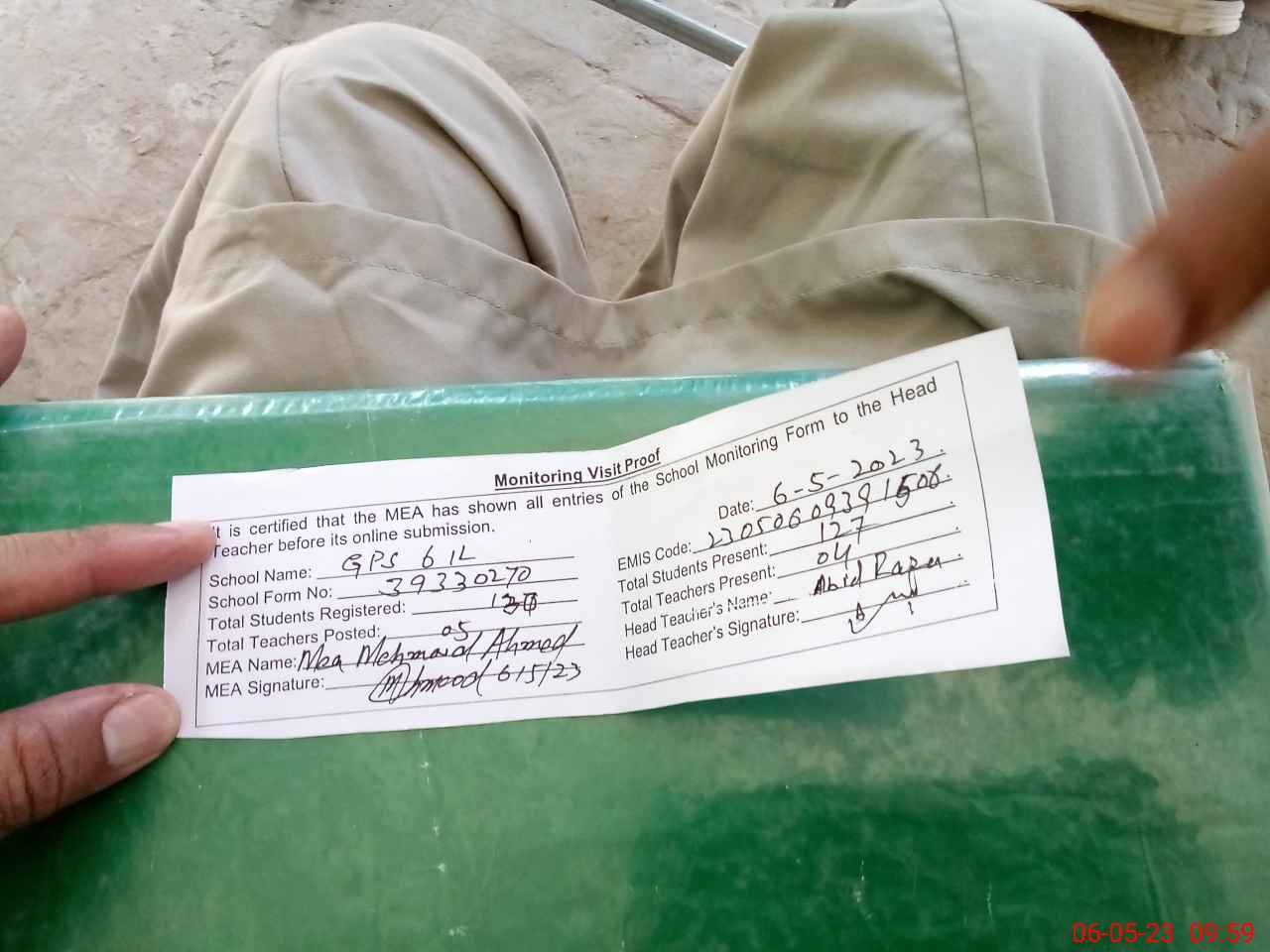 | Attendance Register | Head Teacher | MEA with School | Visit Proof |