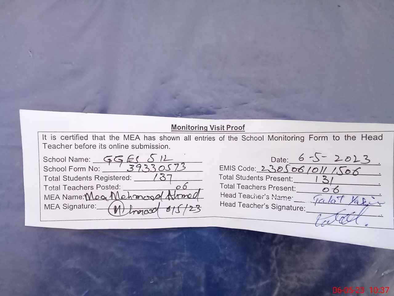 | Attendance Register | Head Teacher | MEA with School | Visit Proof |