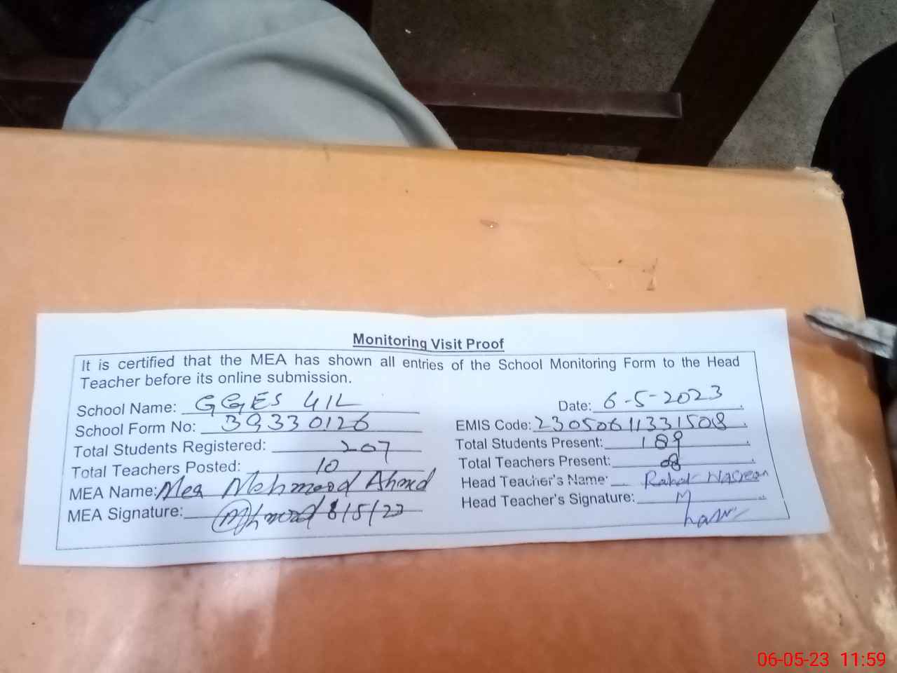 | Attendance Register | Head Teacher | MEA with School | Visit Proof |