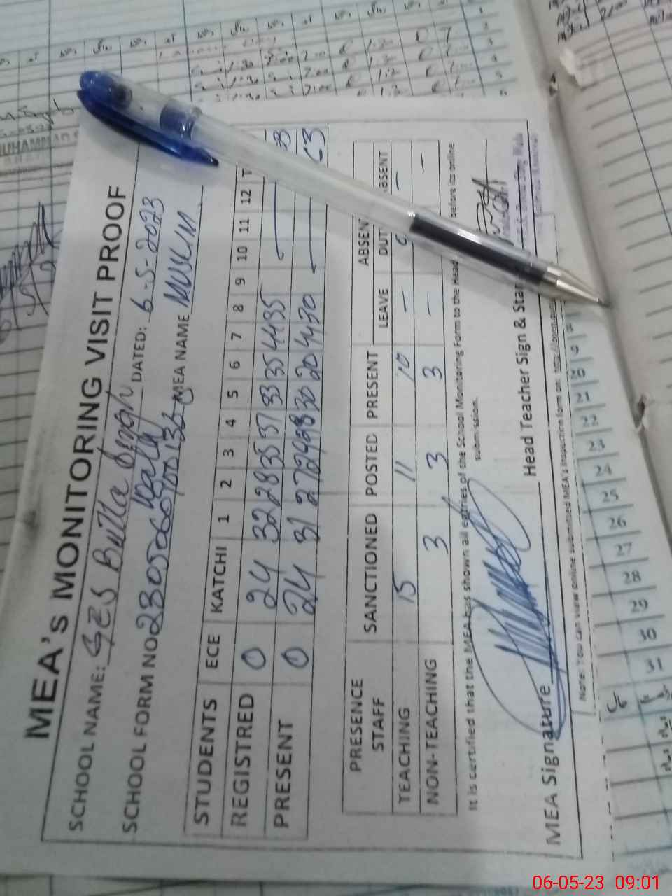 | Attendance Register | Head Teacher | MEA with School | Visit Proof |