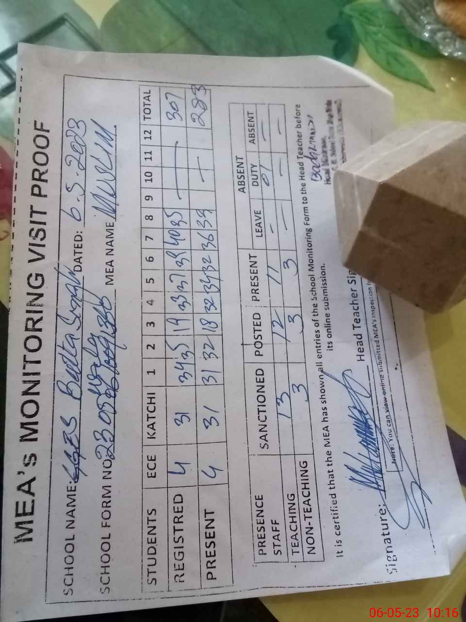 | Attendance Register | Head Teacher | MEA with School | Visit Proof |