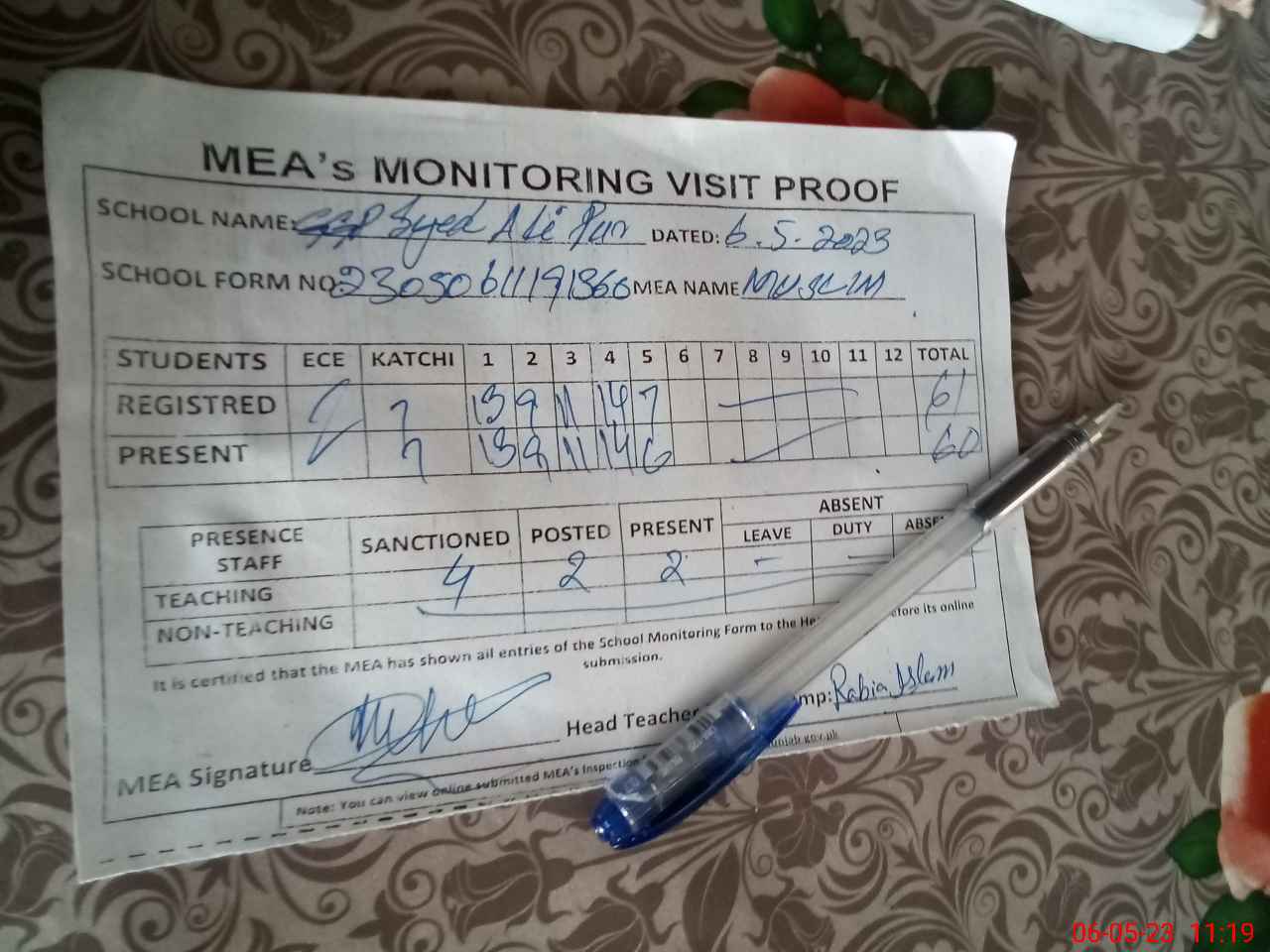 | Attendance Register | Head Teacher | MEA with School | Visit Proof |