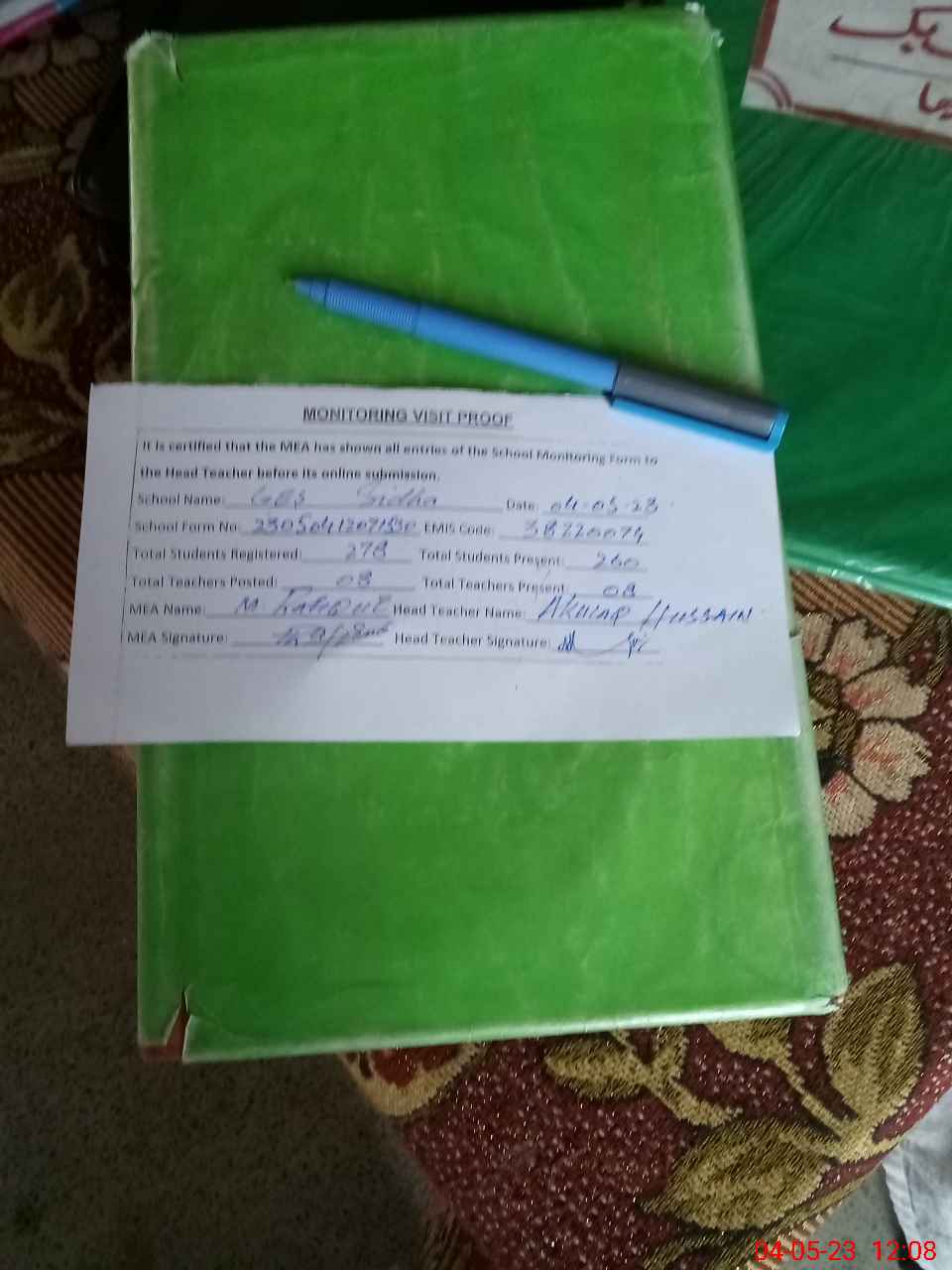 | Attendance Register | Head Teacher | MEA with School | Visit Proof |