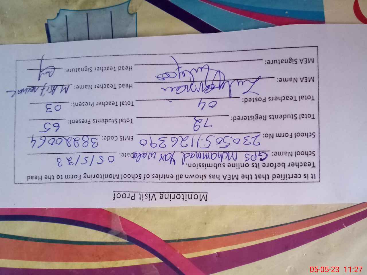 | Attendance Register | Head Teacher | MEA with School | Visit Proof |