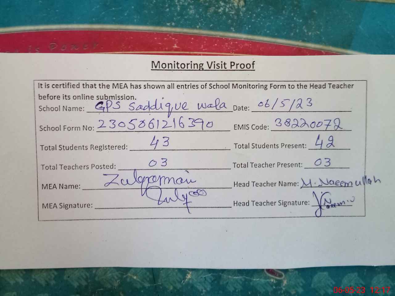 | EMIS Code: 38220072 | Name of School: GPS SIDDIQUE WALA | |||