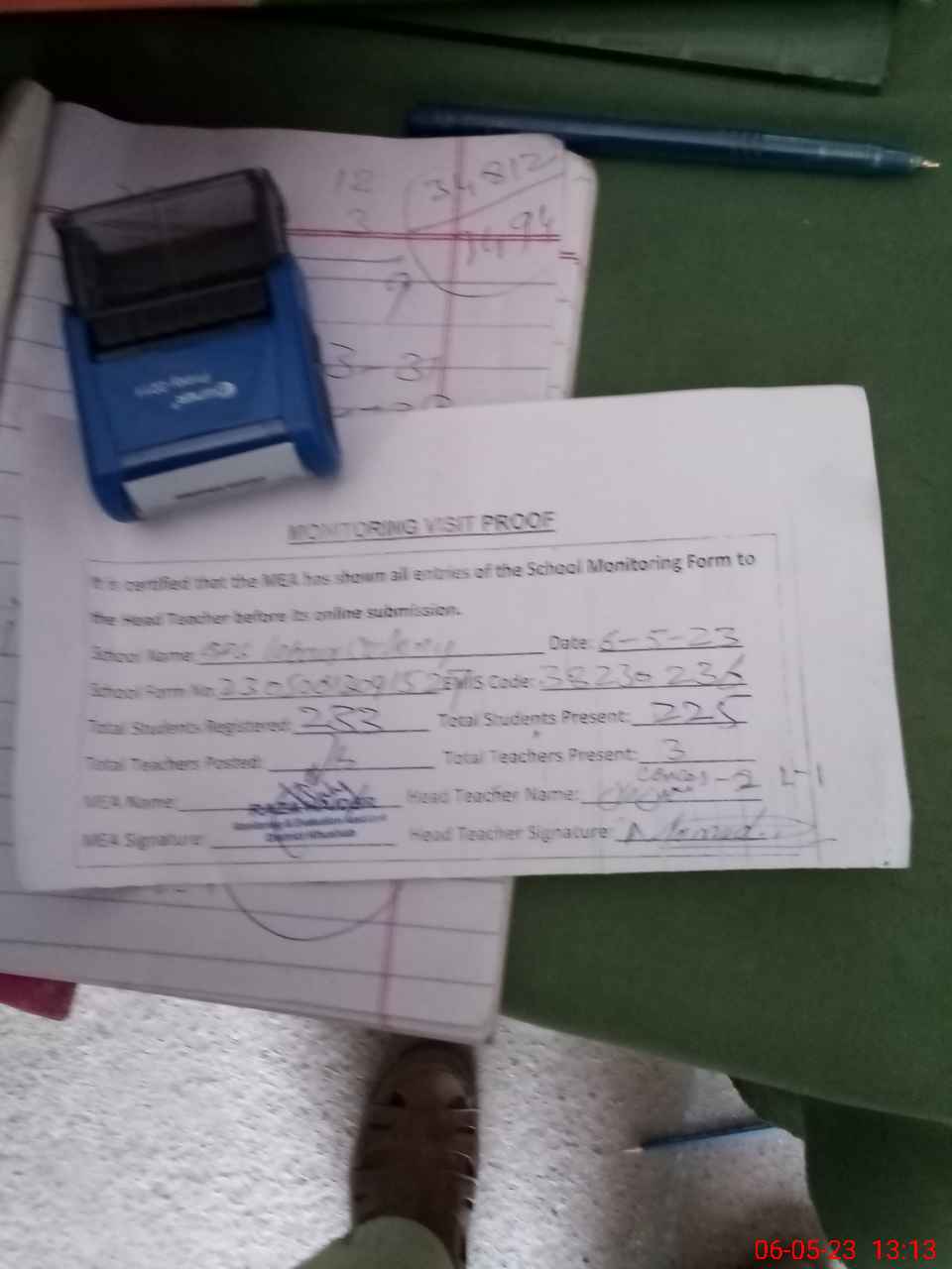 | Attendance Register | Head Teacher | MEA with School | Visit Proof |