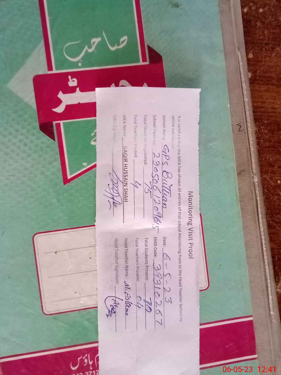 | Attendance Register | Head Teacher | MEA with School | Visit Proof |