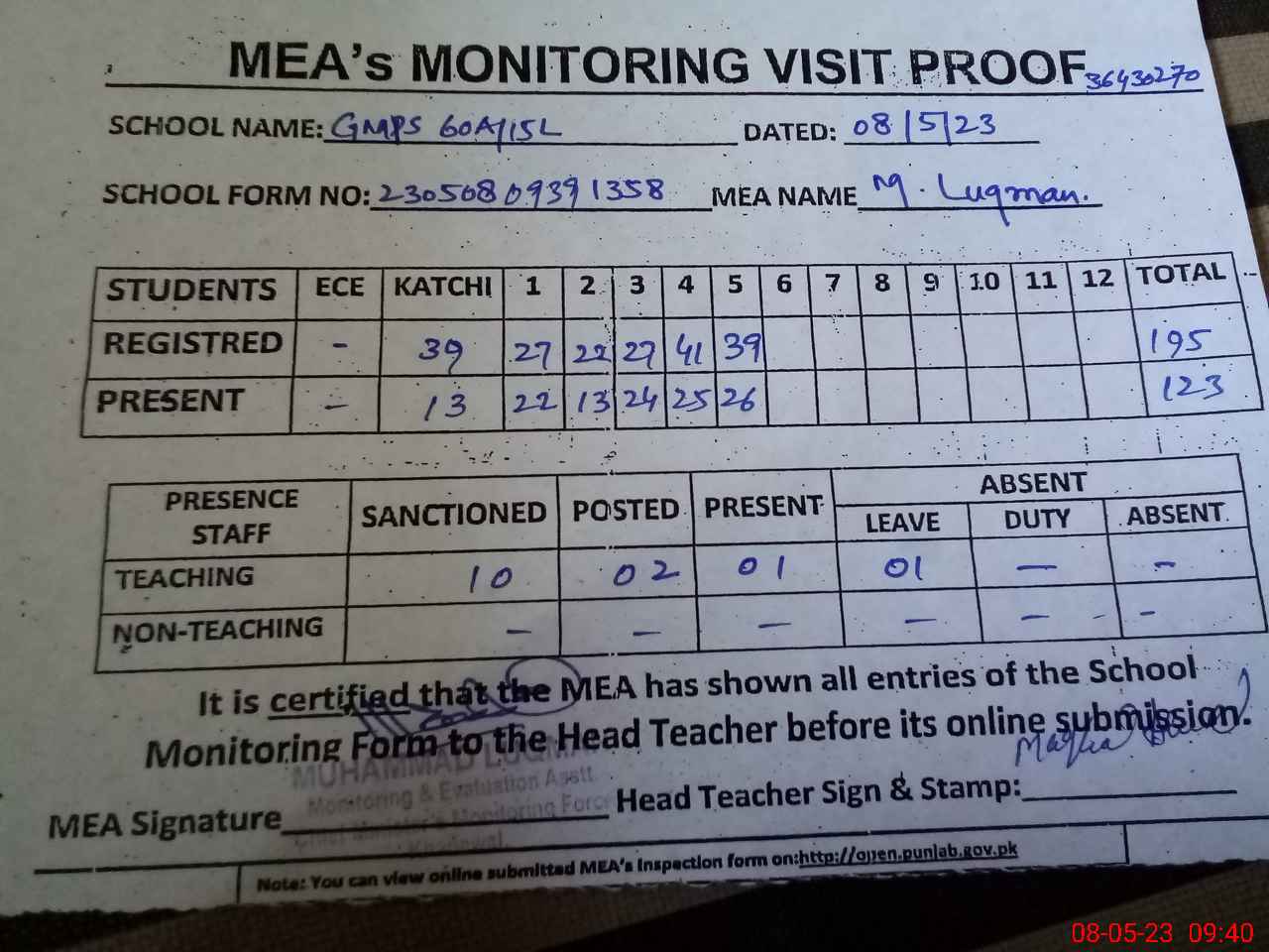 | Attendance Register | Head Teacher | MEA with School | Visit Proof |