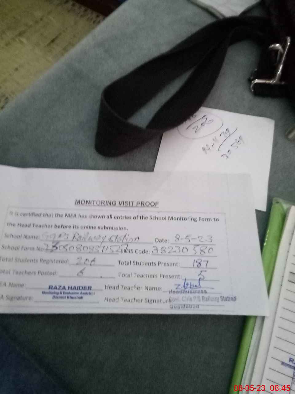 | Monitoring Date: 08-05-2023 | Start Time: 08-05-2023 08:07 AM | End Time: 08-05-2023 08:45 AM | Name of MEA: RA**** HA**** | |