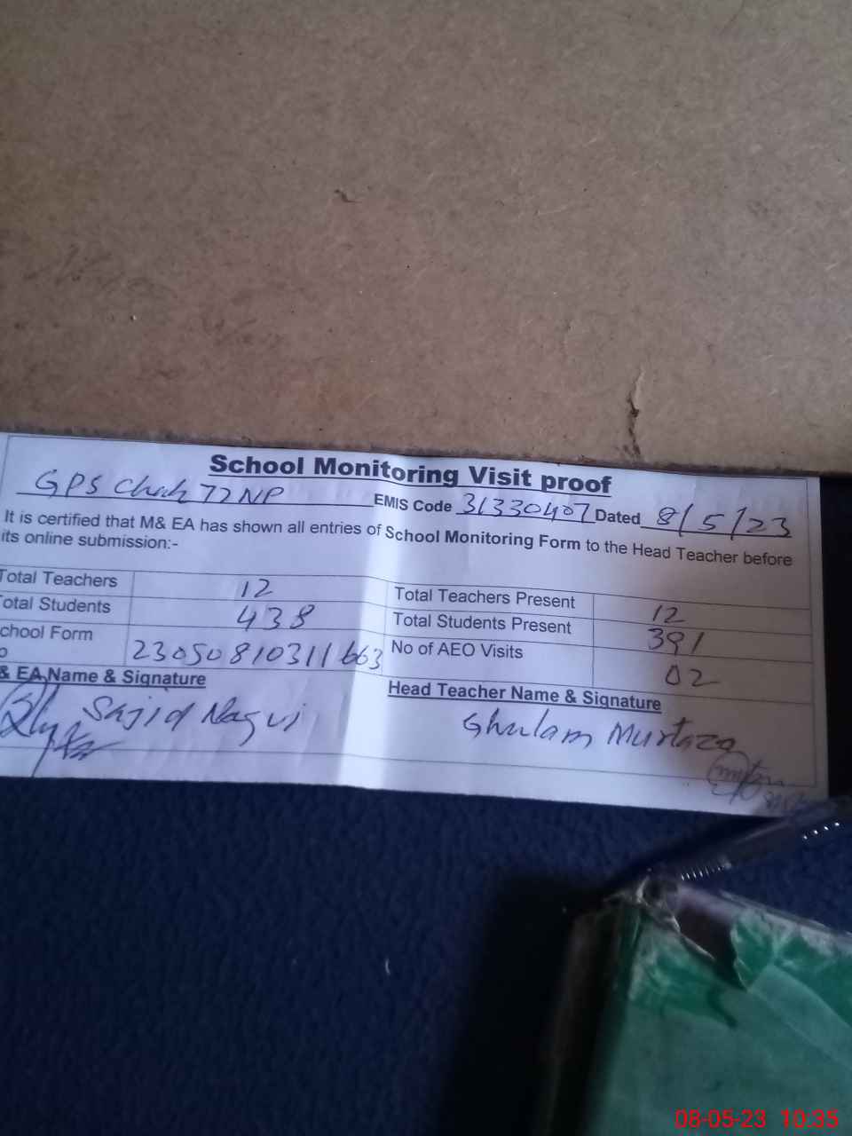 | Attendance Register | Head Teacher | MEA with School | Visit Proof |