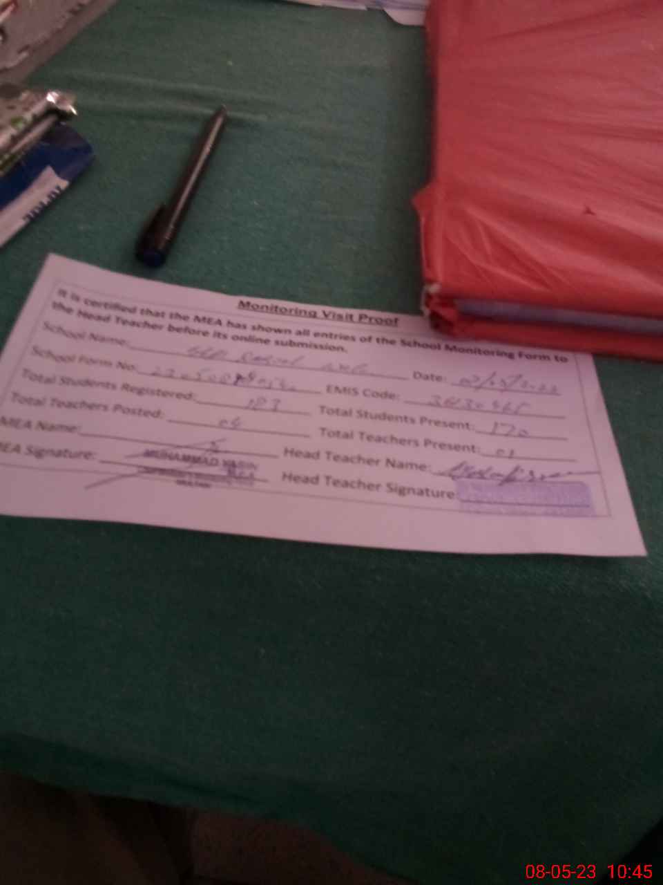 | Attendance Register | Head Teacher | MEA with School | Visit Proof |
