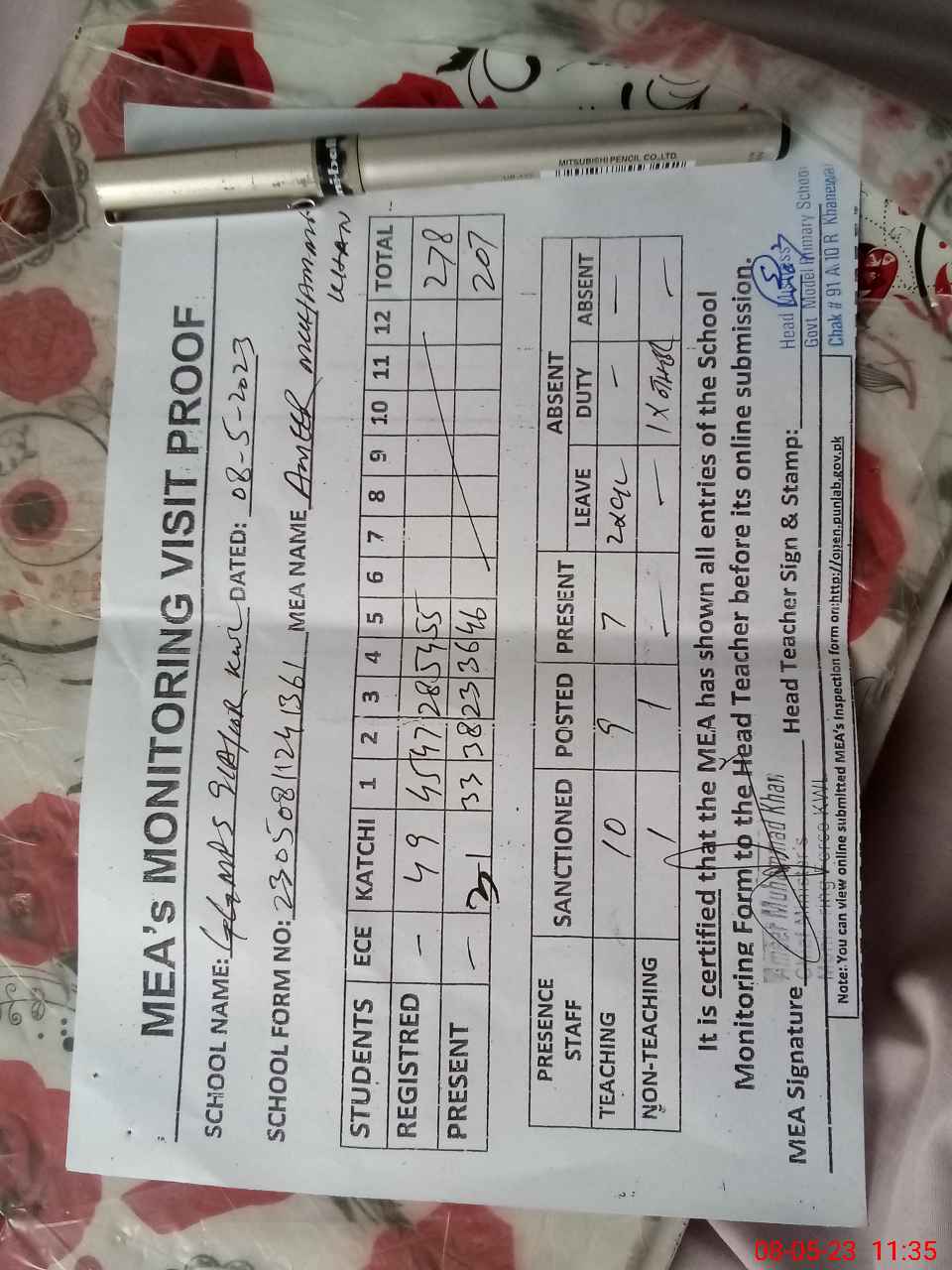 | Attendance Register | Head Teacher | MEA with School | Visit Proof |