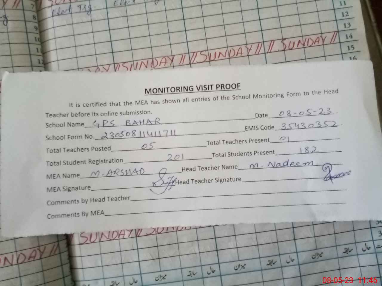 | Attendance Register | Head Teacher | MEA with School | Visit Proof |
