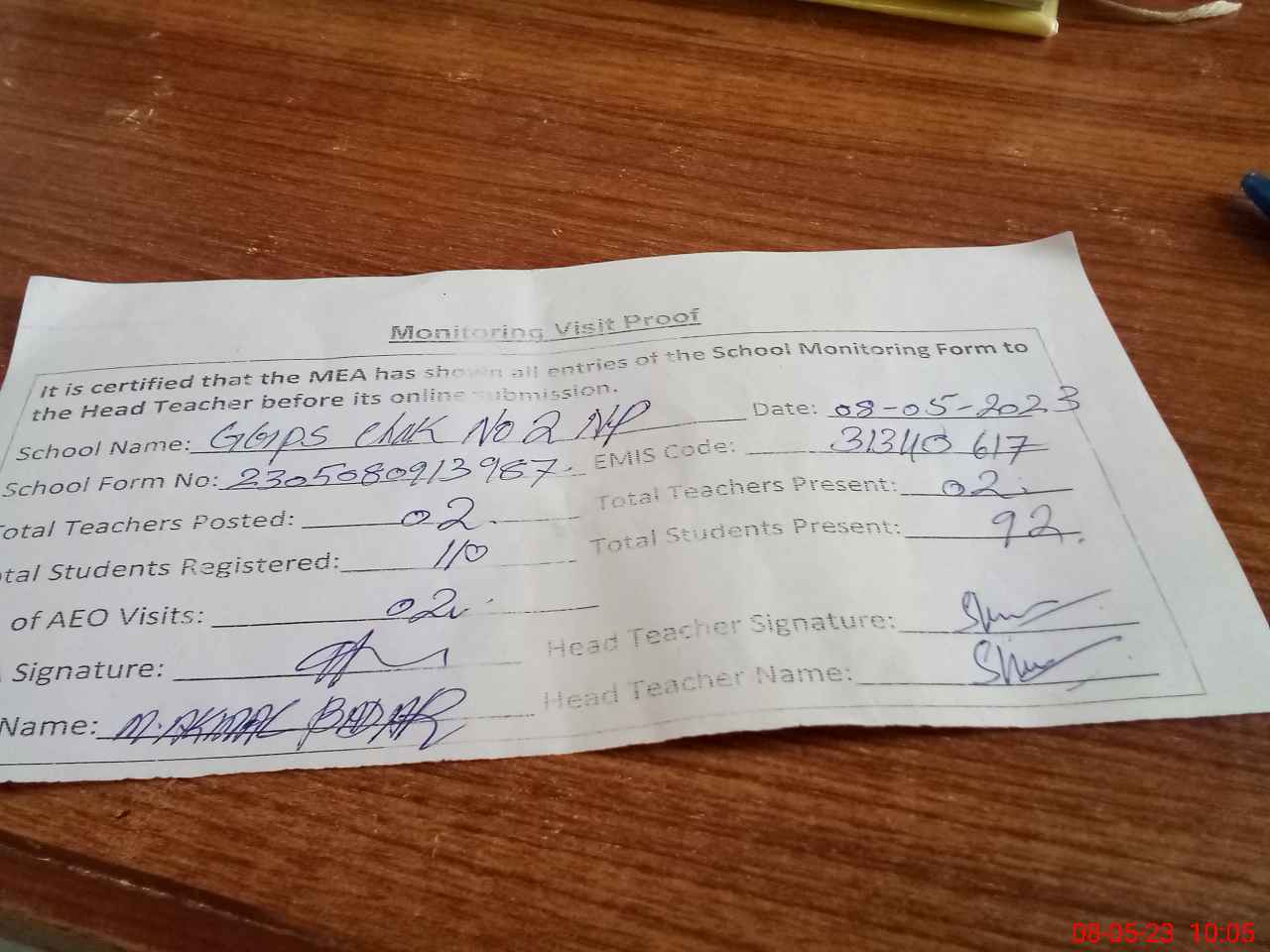 | Attendance Register | Head Teacher | MEA with School | Visit Proof |