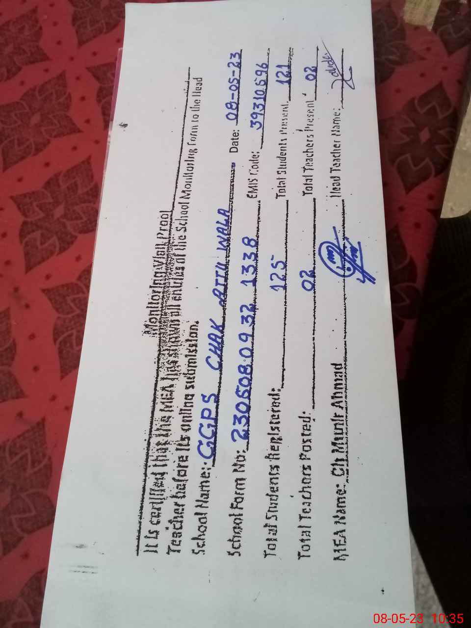 | Certified that this School was Inspected by the Undersigned MEA/DMO Today and the Information Stated Above is as Per Record. | |||||