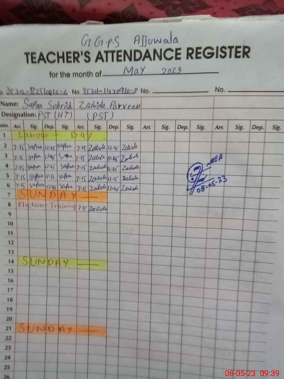 | Name: Za**** Pe**** Designation: (School Headmaster's/Headmistress's) PST Phone/Cell Number: 03**** |