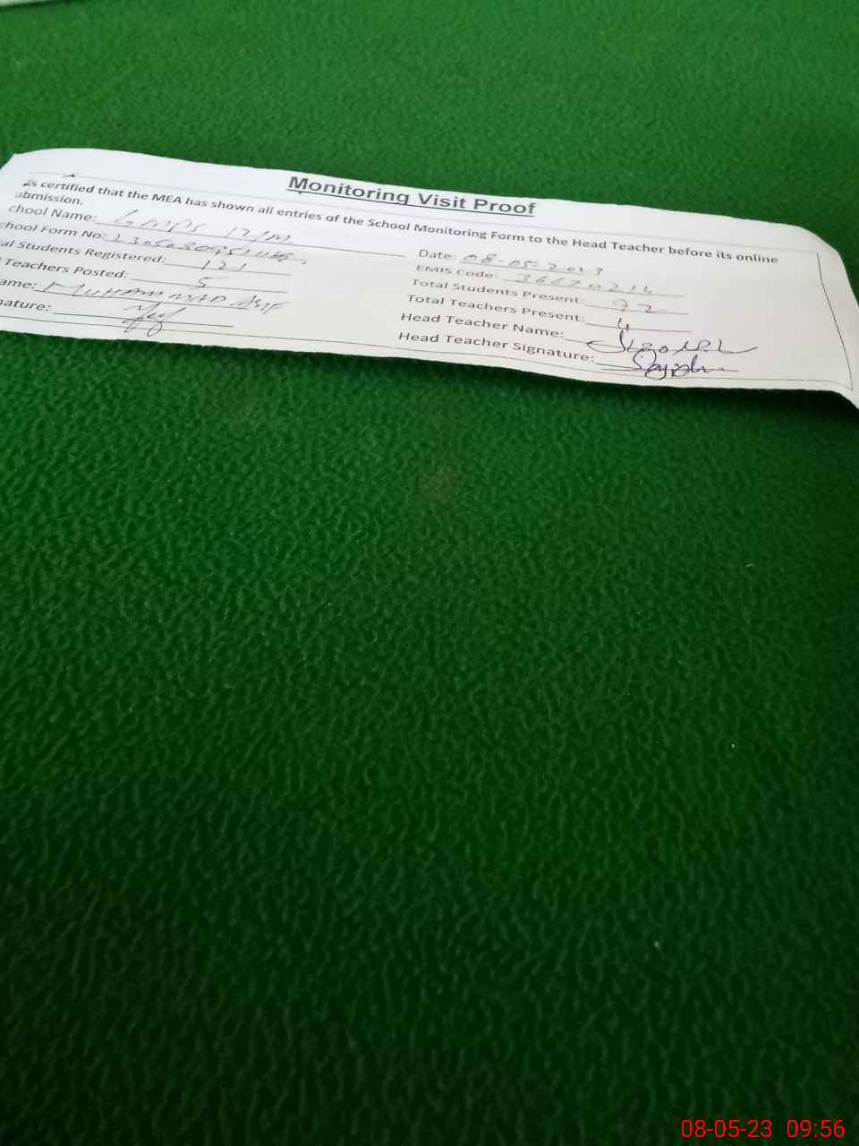 | Attendance Register | Head Teacher | MEA with School | Visit Proof |
