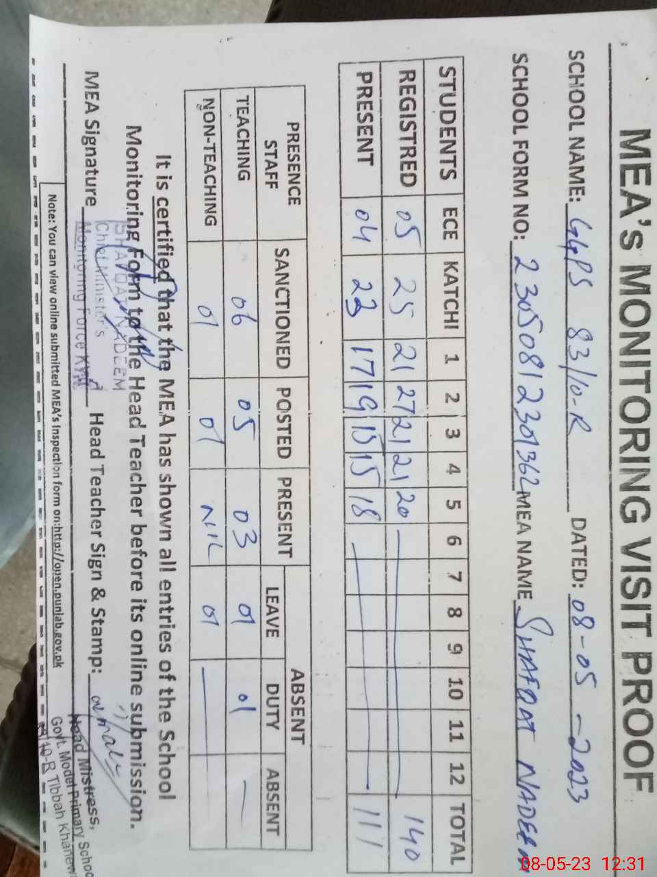 | Attendance Register | Head Teacher | MEA with School | Visit Proof |