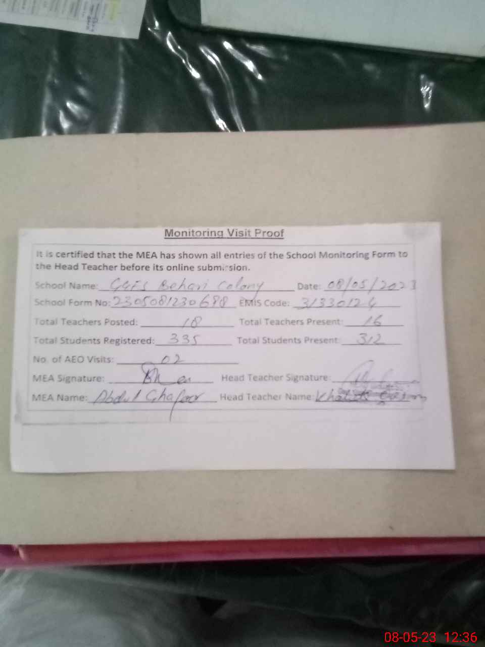 | Attendance Register | Head Teacher | MEA with School | Visit Proof |