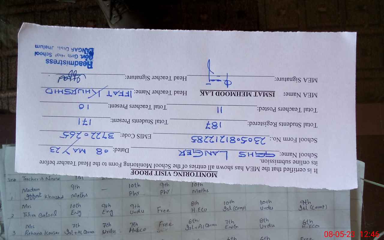 | Attendance Register | Head Teacher | MEA with School | Visit Proof |