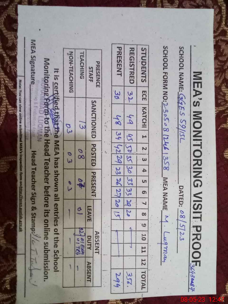 | Attendance Register | Head Teacher | MEA with School | Visit Proof |