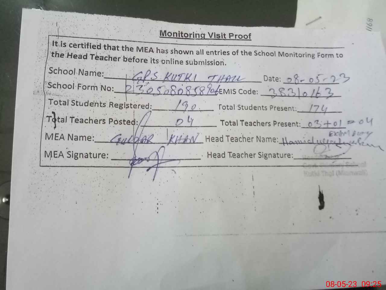 | Attendance Register | Head Teacher | MEA with School | Visit Proof |