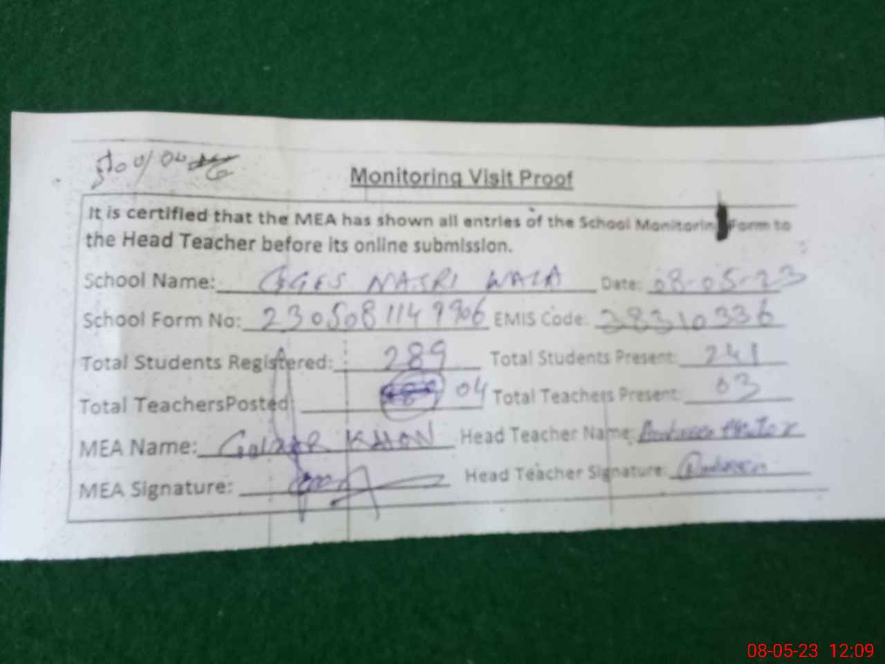 | Attendance Register | Head Teacher | MEA with School | Visit Proof |