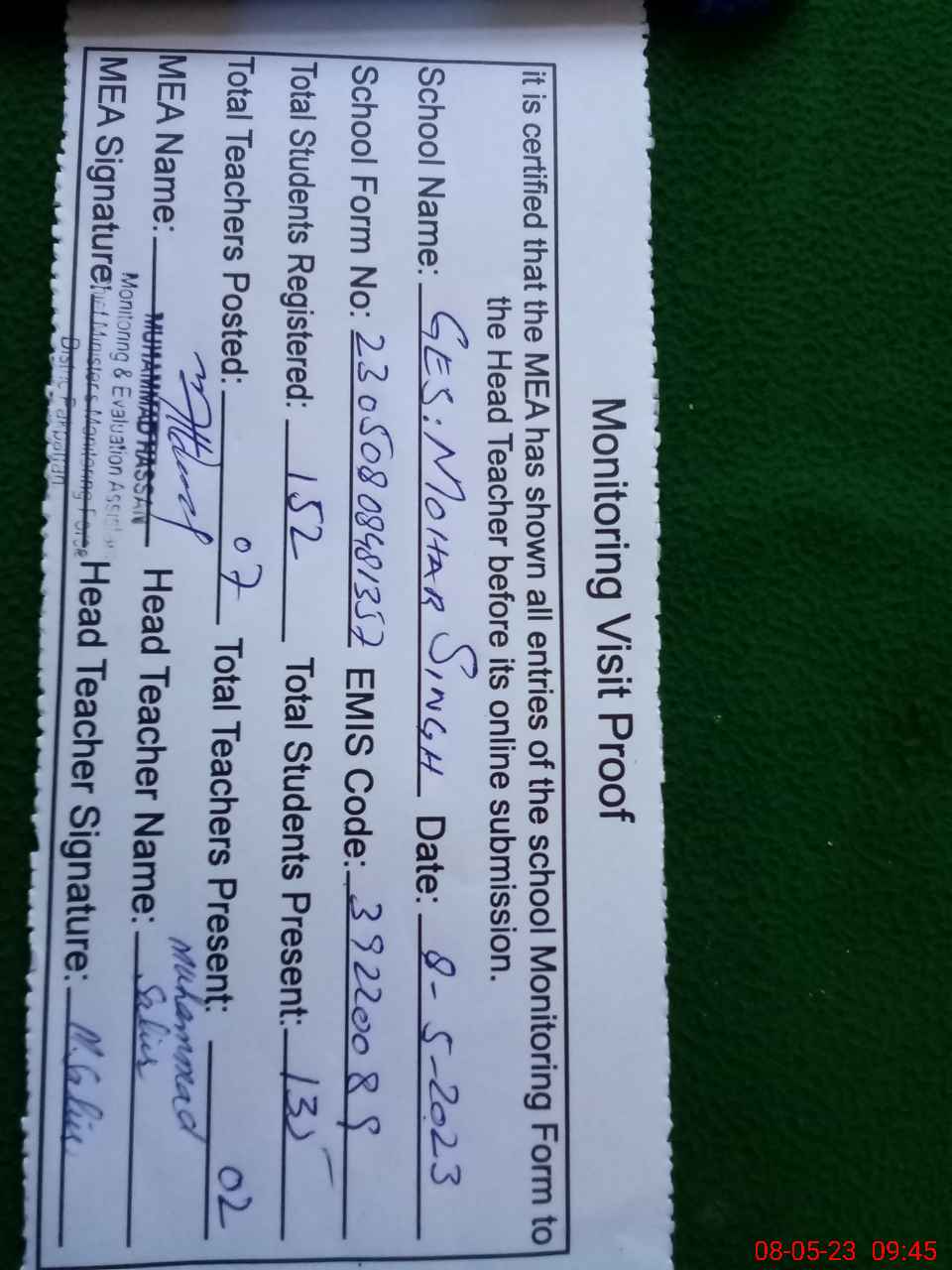 | Attendance Register | Head Teacher | MEA with School | Visit Proof |