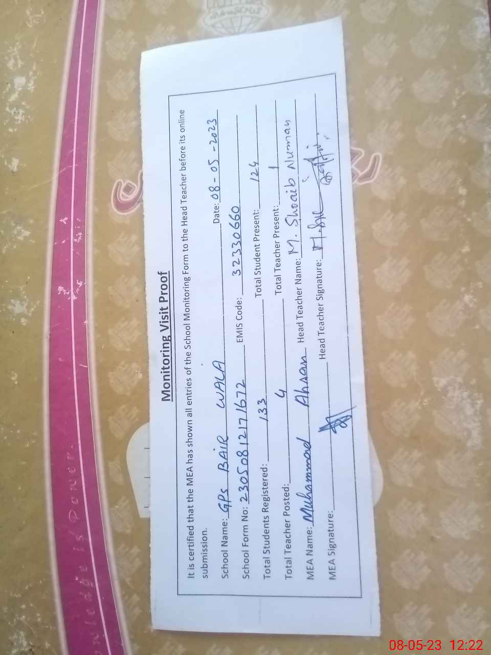 | EMIS Code: 32330660 | Name of School: GPS BAIR WALA | |||