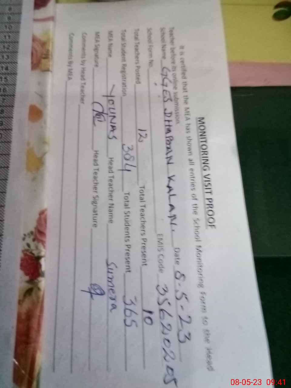 | Attendance Register | Head Teacher | MEA with School | Visit Proof |