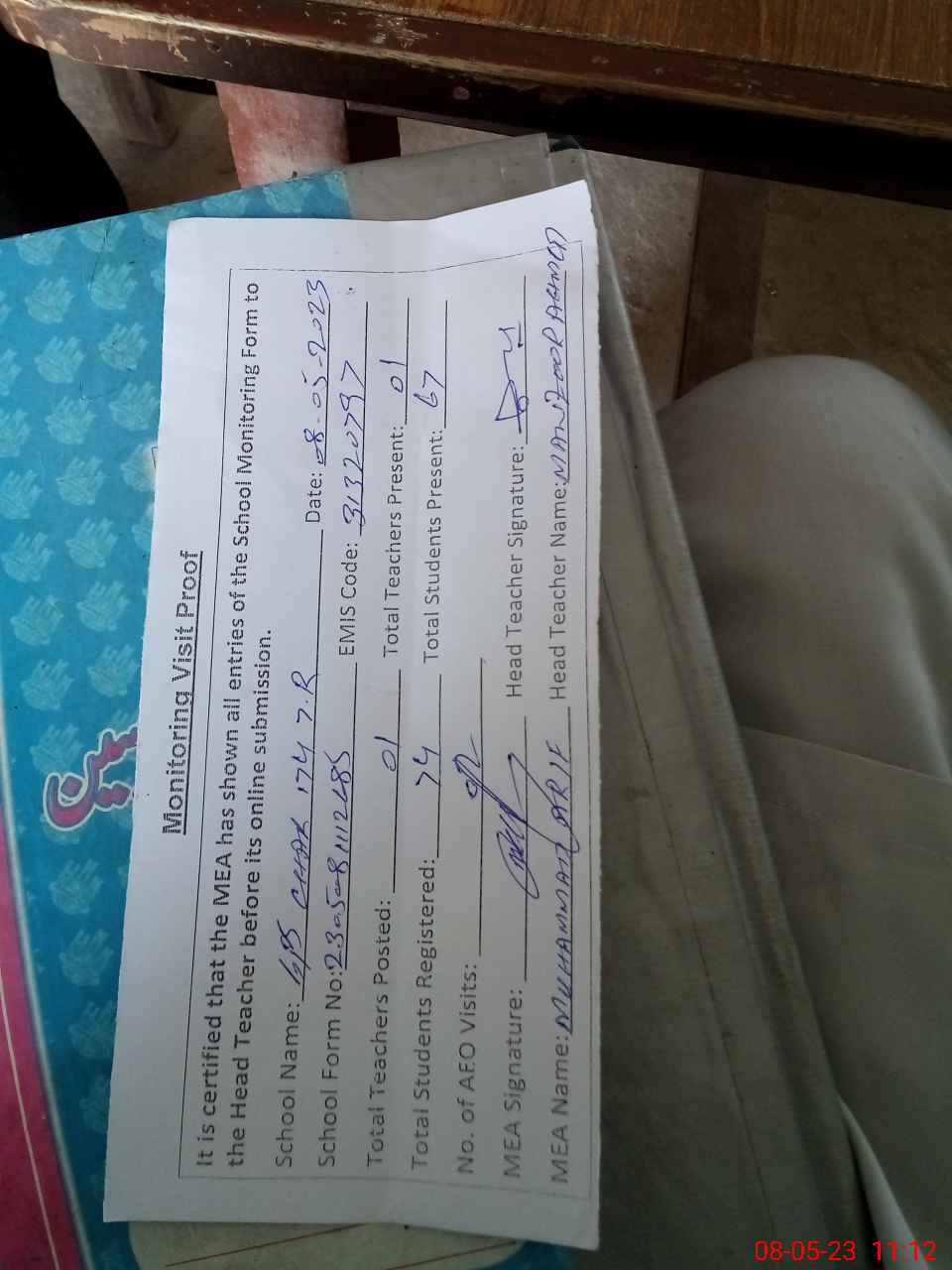 | Attendance Register | Head Teacher | MEA with School | Visit Proof |