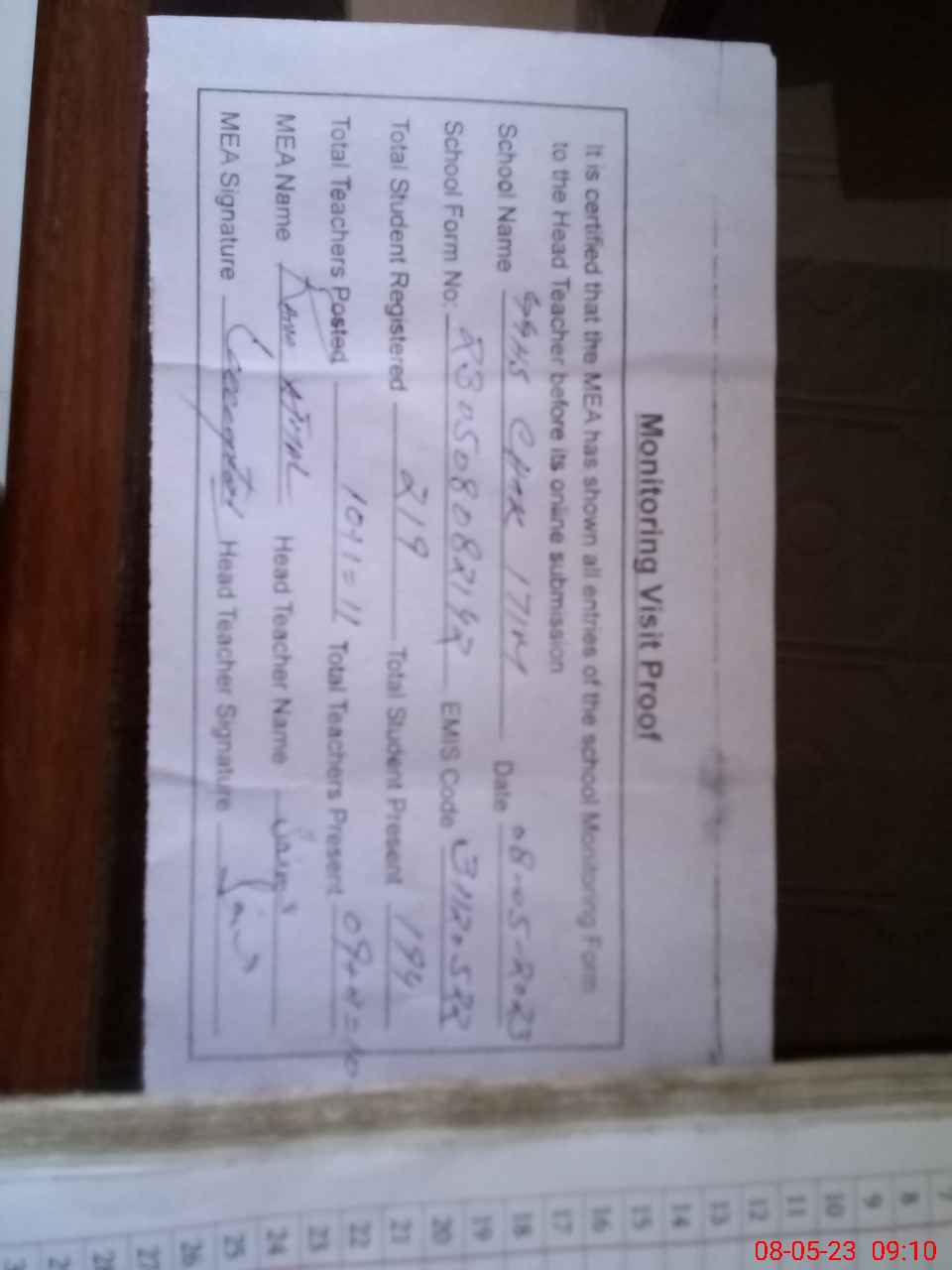 | Attendance Register | Head Teacher | MEA with School | Visit Proof |