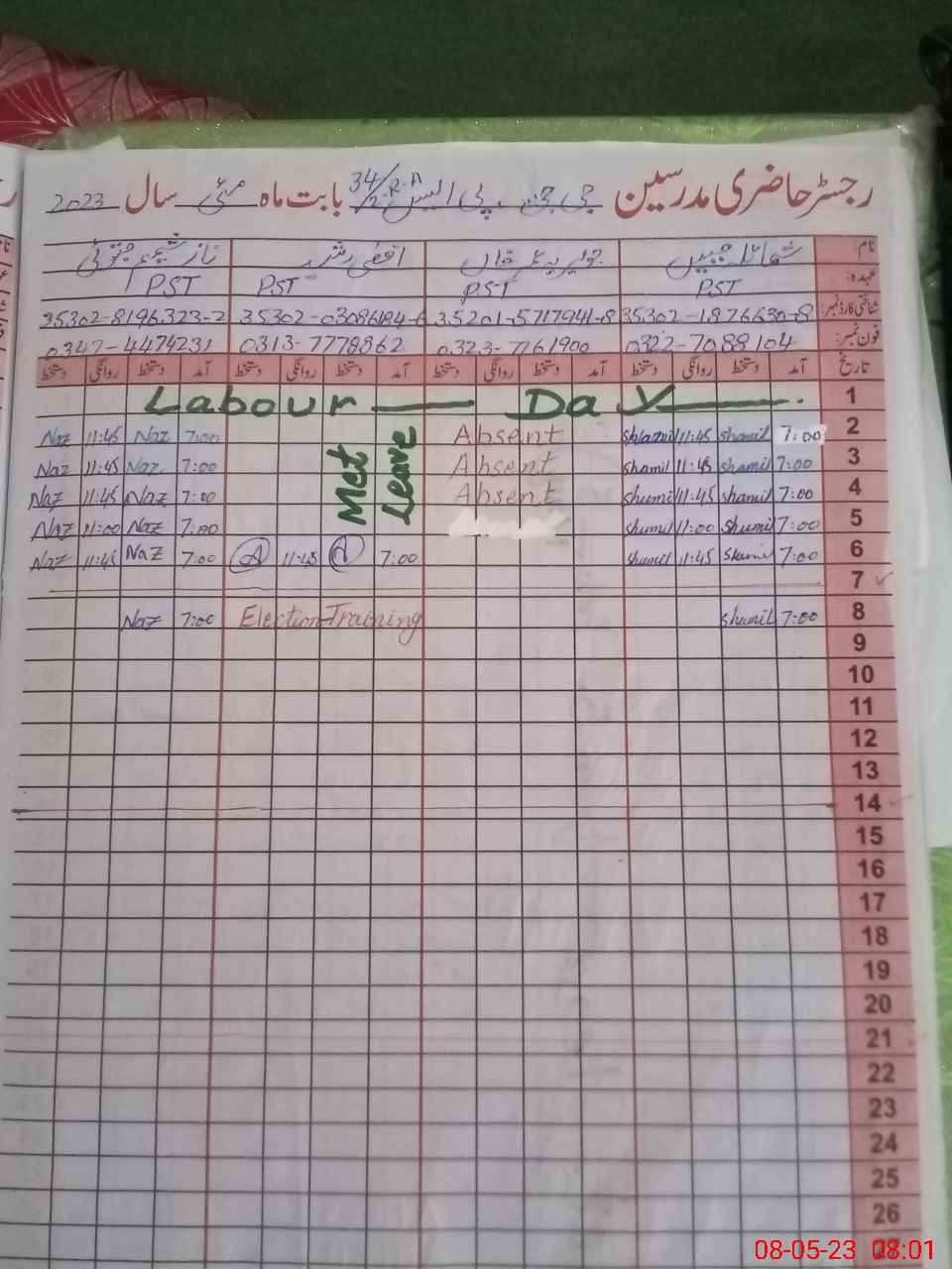 | CNIC | Full Name | Designation | R/C | Absence During Last Calender Month |