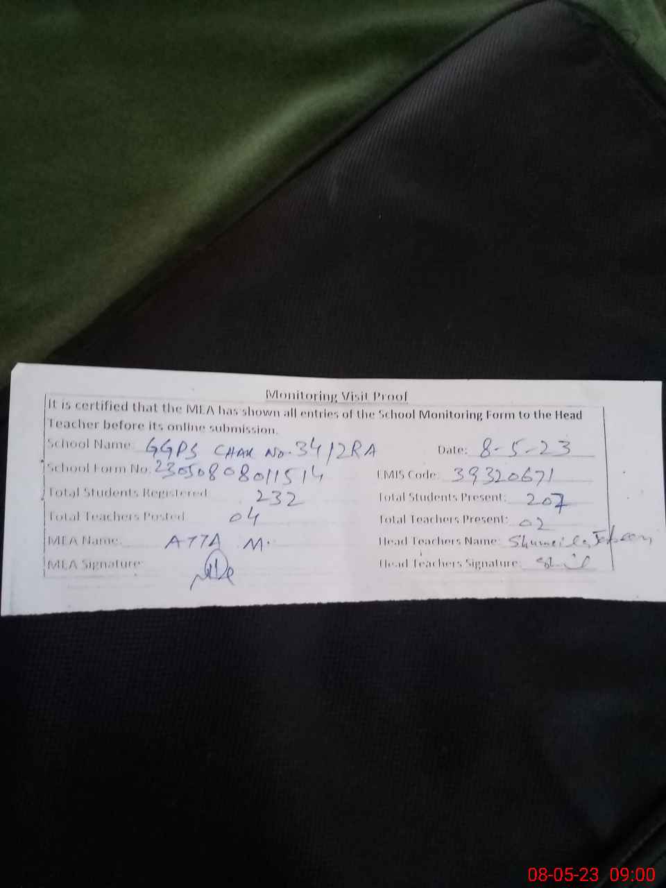 | Attendance Register | Head Teacher | MEA with School | Visit Proof |