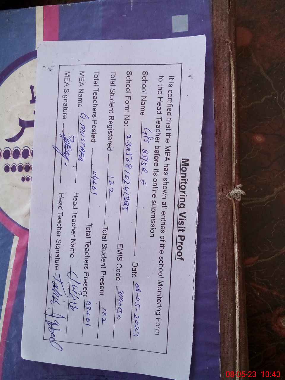 | Attendance Register | Head Teacher | MEA with School | Visit Proof |