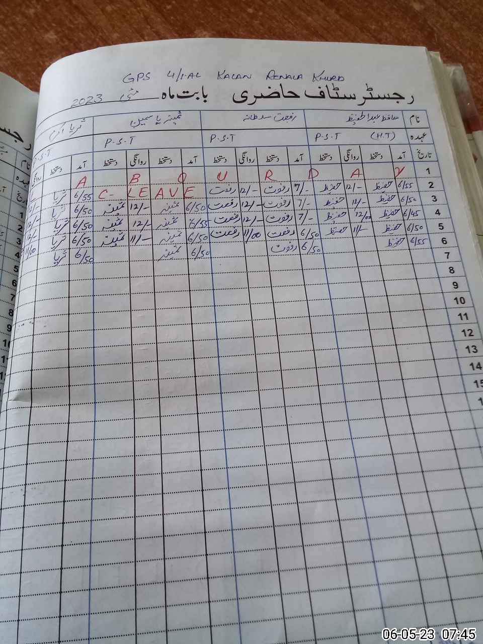 | CNIC | Full Name | Designation | R/C | Absence During Last Calender Month |