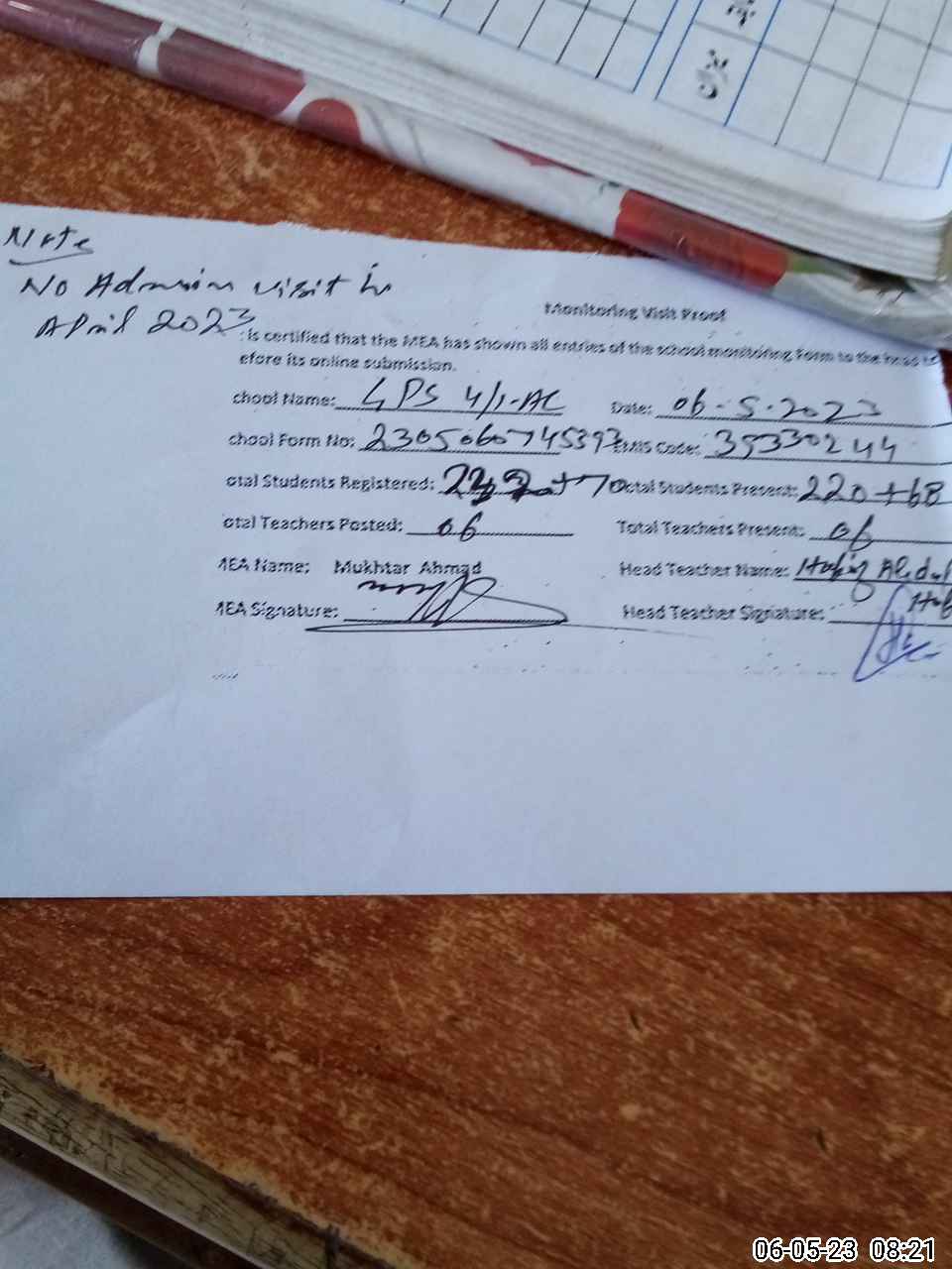 | Attendance Register | Head Teacher | MEA with School | Visit Proof |