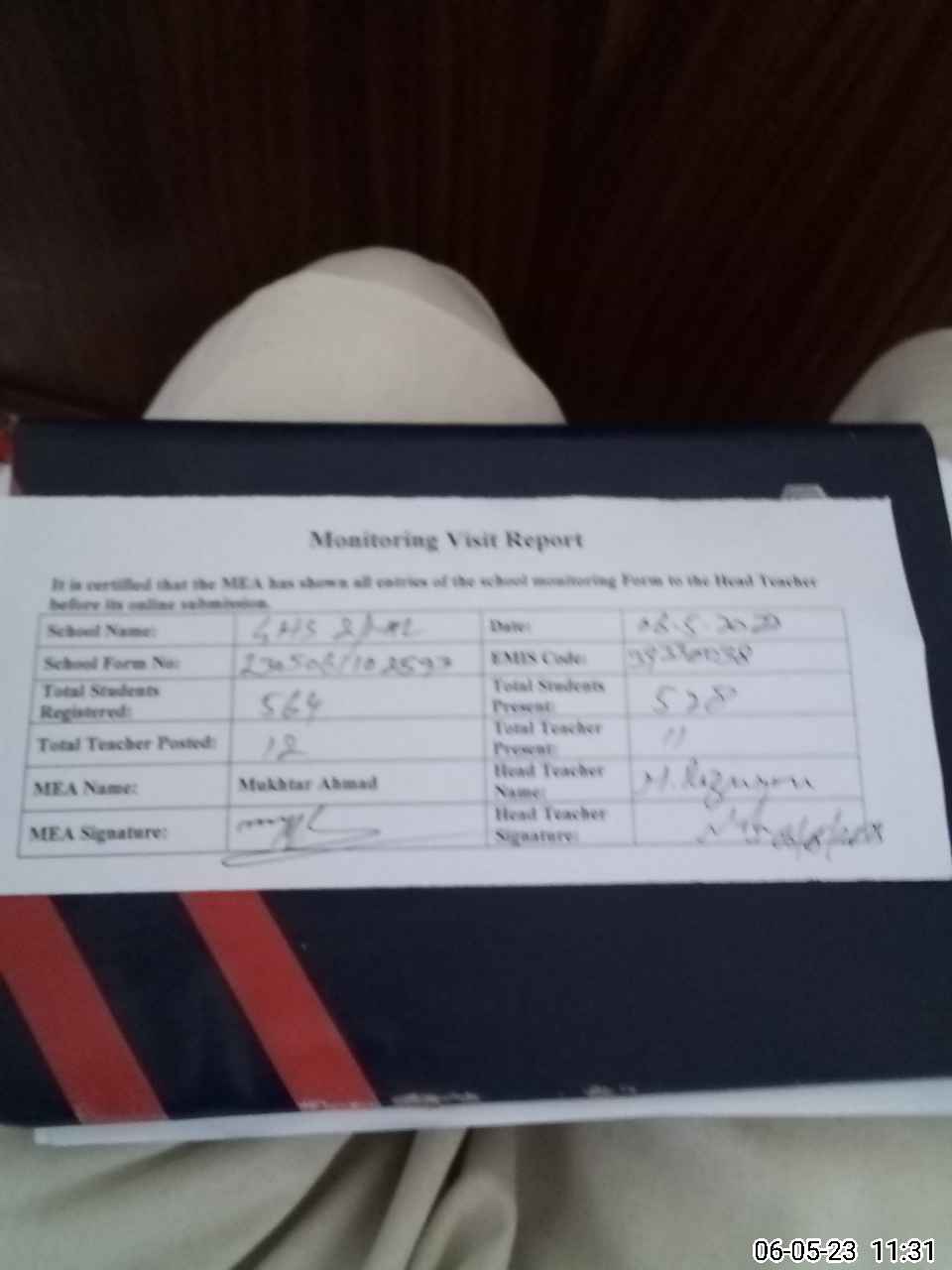 | Attendance Register | Head Teacher | MEA with School | Visit Proof |