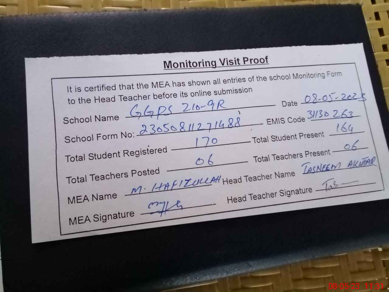 | Attendance Register | Head Teacher | MEA with School | Visit Proof |