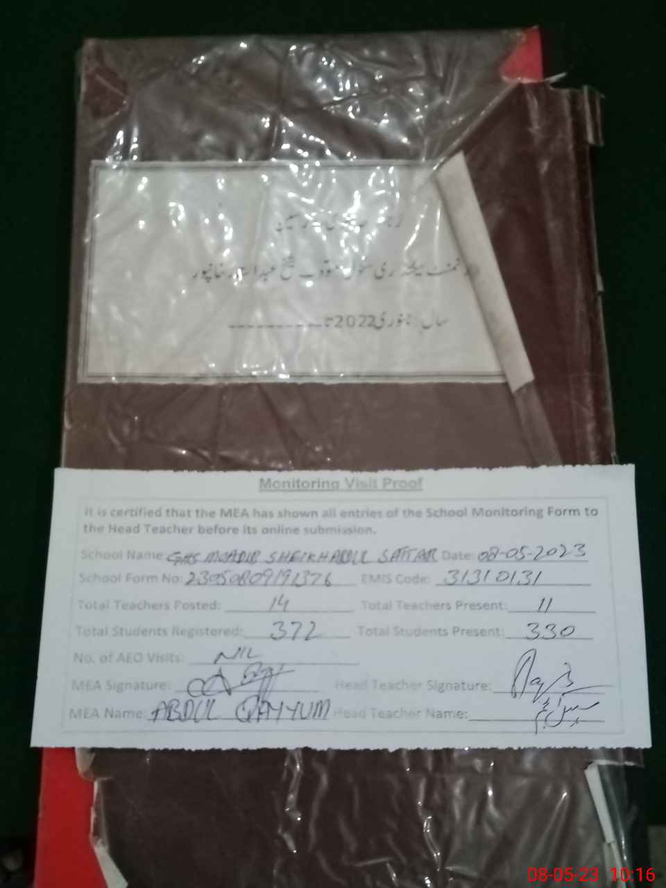 | Attendance Register | Head Teacher | MEA with School | Visit Proof |