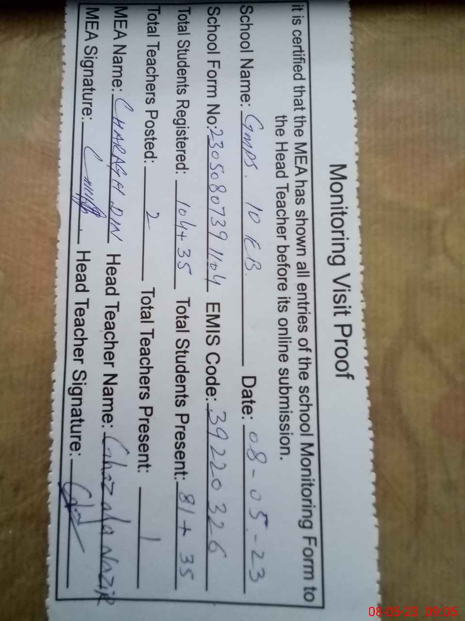 | Attendance Register | Head Teacher | MEA with School | Visit Proof |