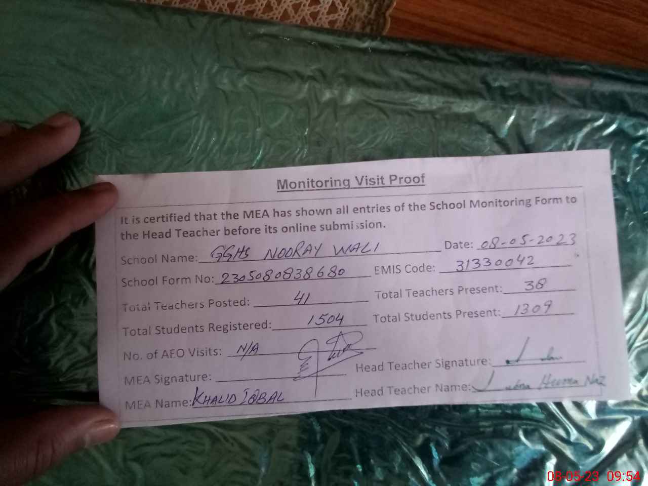 | EMIS Code: 31330042 | Name of School: GGHS NOORAY WALI | |||